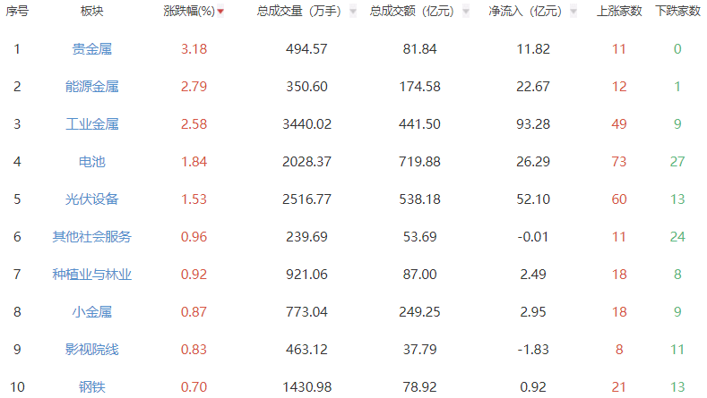 | 序号 | 板块 | 涨跌幅(%)▼ | | 总成交量(万手) = 总成交额(亿元)▼ | 净流入 (亿元) ▼ | 上涨家数 | 下跌家数 | | --- | --- | --- | --- | --- | --- | --- | --- | | 1 | 小金属 | 4.77 | 1378.28 | 460.18 | 32.34 | 26 | 1 | | 2 | 保 | 4.22 | 444.17 | 206.11 | 16.87 | ട | 0 | | 3 | 化学原料 | 3.94 | 2310.25 | 211.18 | 26.42 | 54 | ഗ | | র্ব | 能源金属 | 3.69 | 543.46 | 272.28 | 21.77 | 12 | 1 | | 5 | 证券 | 3.65 | 6984.44 | 932.45 | 157.41 | 50 | 0 | | 6 | 工业等選 | 3.45 | 6088.45 | 843.90 | 39.79 | 56 | N | | 7 | 农化制品 | 2.82 | 1766.89 | 276.20 | 24.16 | રેટ | র্ণ | ...