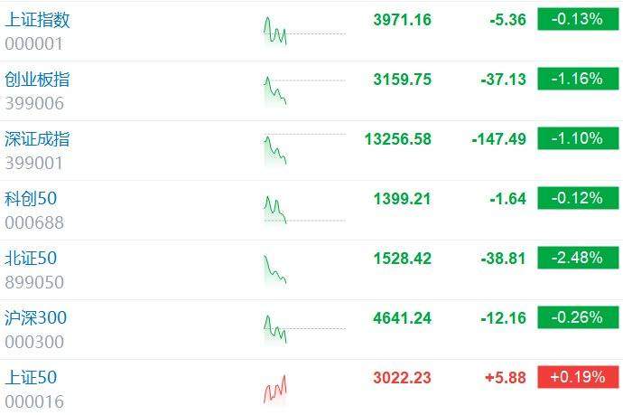 格隆汇11月4日|A股主要指数持续走低,创业板指、深证成指跌幅均扩大至逾1%,沪指跌0.13%;上 证50指数逆势涨0.19%。 | 上证指数 | | 3971.16 | -5.36 | -0.13% | | --- | --- | --- | --- | --- | | 000001 | | | | | | 创业板指 | | 3159.75 | -37.13 | -1.16% | | 399006 | | | | | | 深证成指 | | 13256.58 | -147.49 | -1.10% | | 399001 | | | | | | 科创50 | M | 1399.21 | -1.64 | -0.12% | | 000688 | | | | | | 北证50 | | 1528.42 | -38.81 | -2.48% | | 899050 | | | | | | 沪深300 | Ara | 4641.24 | -12.16 | -0.26% | | 000300 | | | | | | 上证50 | | 3022.23 | +5.88 | +0.19% | | 000016 | | | | | (责任 ...