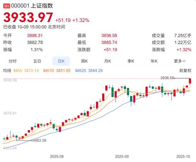 截至收盘,上证指数涨1.32%报3933.97点,深证成指涨1.47%,创业板指涨0.73%。沪深两市合计成交额 超过2.6万亿,较上一交易日大幅放量近5000亿。盘面上,行业板块涨多跌少,贵金属、能源金属、小 金属、有色金属、风电设备、钢铁行业、煤炭行业涨幅居前,旅游酒店、房地产服务板块跌幅居前。 黄金股表现抢眼 杭州股民日内追高被套 国庆长假期间,国际金价大幅度上涨。伦敦金现货盘中突破4000美元/盎司,再创历史新高,最高价报 4049.64美元/盎司,假期期间累计上涨4.72%,COMEX黄金最高价报4072美元/盎司,累计上涨4.74%, 这使得节后首个交易日黄金概念股大涨变得没有悬念。 "十一"长假后的首个交易日,A股并没有受到港股最近两个交易日的扰动,三大指数高开高走迎来"开 门红"行情。其中,沪指盘中突破3900点整数大关,刷新2015年8月以来新高。 "10月市场将会延续9月的趋势,保持震荡上行且低斜率的走势。目前市场处在牛市第二阶段的判断没有 发生变化,增量资金持续流入的态势也没有发生变化,指数上行速度放缓后,增量资金更加平稳,是驱 动市场稳健上行的关键力量。"招商证券分析指出。 驱动A股市 ...