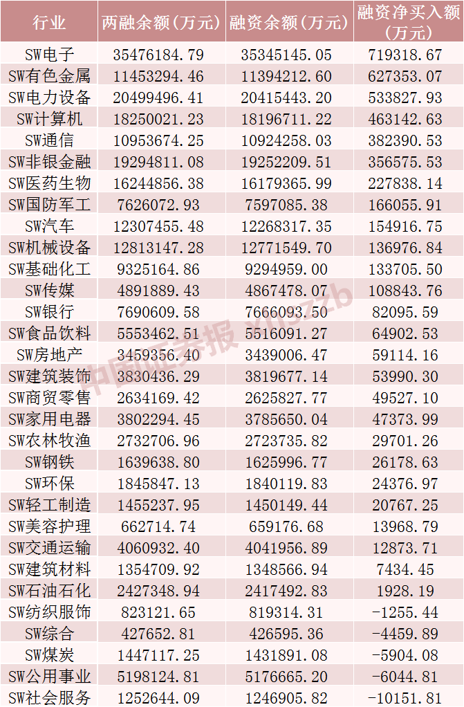 Wind数据显示,截至10月31日,A股市场融资余额报24689.20亿元,融券余额报174.82亿元,10月融资余额增加905.30亿元。 10月电子行业融资余额增加超180亿元,A股市场融资净买入金额最大的股票为中际旭创,净卖出金额最大的股票为先导智能。 加仓电子行业超180亿元 Wind数据显示,截至10月31日,A股两融余额报24864.02亿元,融资余额报24689.20亿元,10月A股市场融资余额增加905.30亿元。10月29日,A股两融余 额和融资余额均创历史新高。 具体来看,10月的17个交易日中,有12个交易日出现融资净买入,占比超七成。 从行业情况来看,10月申万一级31个行业中有28个行业融资余额增加,电子、有色金属、电力设备行业融资净买入金额居前,分别为181.01亿元、115.01 亿元、79.76亿元。仅有食品饮料、汽车、轻工制造行业出现融资净卖出,净卖出金额分别为17.15亿元、1.45亿元、0.45亿元。 | 行业 | 两融余额(万元) | 融资余额(万元) | 融资净买入额 | | --- | --- | --- | --- | | | | | (月元) | | SW电子 ...