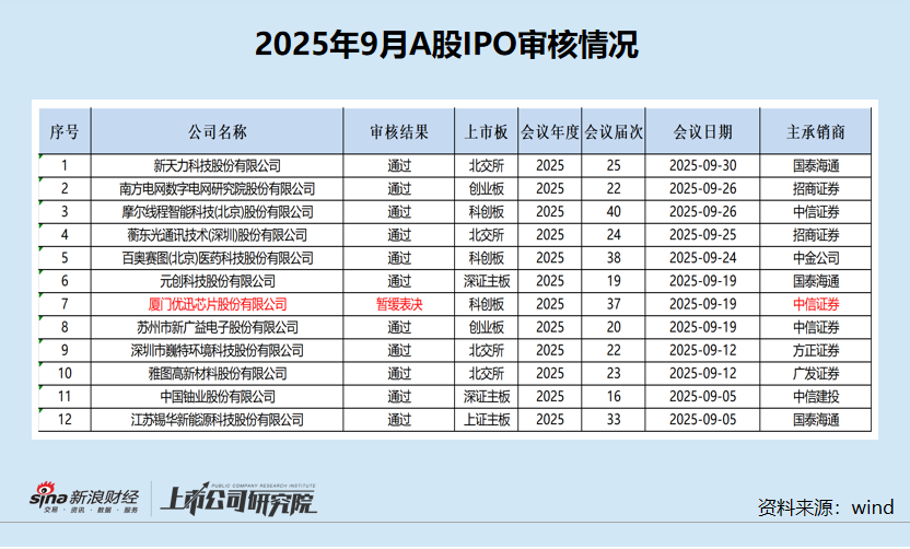 终止层面,2025年9月有7家企业终止A股IPO进程,终止数量连续三个月维持在个位数。2025年1-9月份,A股IPO企业终止数量合计91家,较2024年前三季度 的数据(350家)同比下降74%。 发行及募资层面,2025年9月新上市的A股IPO企业有11家,合计募资116.9亿元。2025年1-9月,A股合计有78家新股发行,合计募资773.02亿元,IPO上市企 业及募资总额较2024年前三季度同比分别增长13.04%、61.49%。 炒股就看金麒麟分析师研报,权威,专业,及时,全面,助您挖掘潜力主题机会! 出品:新浪财经上市公司研究院 作者:IPO再融资组/郑权 2025年9月,共有12家拟IPO企业上会审核,过会11家,名义过会率为91.67%。2025年1-9月份,A股IPO企业上会数量为61家,过会数量为58家,名义过会率 为95.08%,较2024年1-9月份的85.37%(数据来自wind)上升近10个百分点。 上会审核情况:优迅股份遭暂缓审议 股份支付会计处理存疑 9月,共有12家拟IPO企业上会审核,过会11家,名义过会率为91.67%。其中厦门优迅芯片股份有限公司(下称"优迅股份")遭 ...