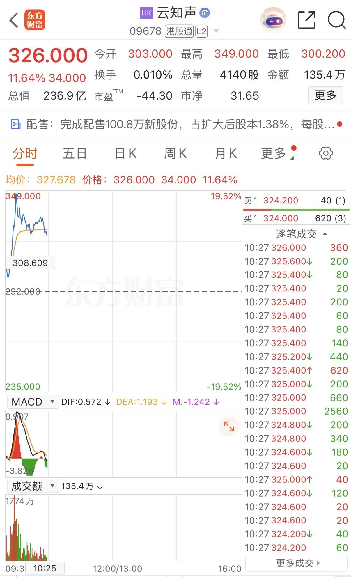 2月10日早盘,多只港股AI医疗概念股表现活跃。截至10时25分,云知声涨11.64%,英矽智能涨9.46%,医渡科技涨2.94%,晶泰控股涨2.66%。 上证报中国证券网讯(记者 孔令仪)2月10日早盘,多只港股AI医疗概念股表现活跃。截至10时25分,云知声涨11.64%,英矽智能涨9.46%,医渡科技涨 2.94%,晶泰控股涨2.66%。 | | | | | 10:27 324.800 | | --- | --- | --- | --- | --- | | | | | | 10:27 324.600↓ | | -3.82 | | | | 10:27324.600 | | 成交额 | A | 135.4万 ↓ | | 10:27 325.000↑ | | 1774万 | | | | 10:27 324.600↓ | | | | | | 10:27 324.600 | | | | | | 10:27324.600 | | | | | | 10:27 324.200↓ | | | | | | 10:27 324.200 | | 09:3 | 10:25 | 12:00/13:00 | 16:00 | 更多成交 ...