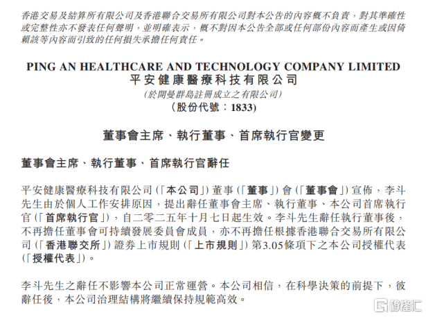 十月伊始,平安好医生(01833.HK)发布公告,李斗先生因个人工作安排辞任公司董事会主席、执行董事、首席执行 官,现任平安集团联席首席执行官、平安好医生非执行董事郭晓涛将兼任该公司董事会主席一职,委任何明科为公司 首席执行官、执行董事,自公告之日起生效。 这次公告的背后,透露出什么信息? 图表一:平安好医生公告 数据来源: WIND ,格隆汇整理 交接平稳有序,延续高效治理结构 具体来看此次公告内容。 郭晓涛先生,作为新任平安集团联席CEO,其兼任平安好医生董事会主席,在平安体系内历经多个关键岗位历练,从 财产险到集团首席人力资源官,再到联席CEO,其职业轨迹贯穿保险、科技、管理等多个核心领域。更为重要的是, 他在国际顶级咨询公司积累的丰富经验,使其成为推动大型机构战略转型升级的合适人选。 平安好医生作为平安集团医疗养老生态圈的核心载体,承担着将集团综合金融资源与医疗健康服务深度融合的战略使 命。郭晓涛先生的坐镇,有助于强化平安好医生与集团在"金融+医疗"战略上的协同效能,为业务深度融合提供有力保 障。 何明科先生出任平安好医生首席执行官,则反映出公司在发展阶段对专业能力的前瞻性布局。何明科先生拥有跨行业 ...