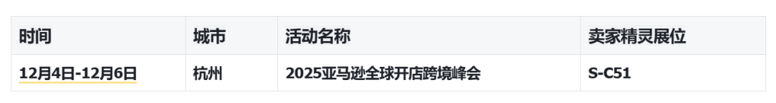 2025亚马逊全球开店跨境峰会将于12月4日至7日于杭州举办,主题为"向优、向新、向全球"。届时将重磅发布2026年亚马逊全球开店中国核心战略,并设置 六大平行论坛,全链路解读跨境出海最新趋势与解决方案。超2万平米展区搭配一对一官方咨询,助力卖家高效对接资源;另有官方讲堂与特训营,提供实 战培训与政策解读,帮助卖家即学即用、破解运营痛点。本次峰会内容覆盖广泛,无论你是初入行业的跨境新人、寻求转型的工厂经营者,还是深耕一线的 运营专家,均能获取针对性的高价值内容,收获切实的参与感与成长体验。 | 时间 | 城市 | 活动名称 | 卖家精灵展位 | | --- | --- | --- | --- | | 12月4日-12月6日 | 杭州 | 2025亚马逊全球开店跨境峰会 | S-C51 | 本届峰会还针对不同性格卖家设计了专属场景:内向型(i人)卖家可在跨境展区"卖家面对面"专注聆听真实案例与可复制造型,间接获取关键经验;外向 型(E人)卖家则能通过跨境咖啡吧实时交流组圈,或在融合AI互动、美食与表演的"跨境不夜城"中拓展人脉、结识合作新伙伴。通过多元场景的精准适 配,本届峰会可以让每位跨境从业者都能在契合自身 ...
