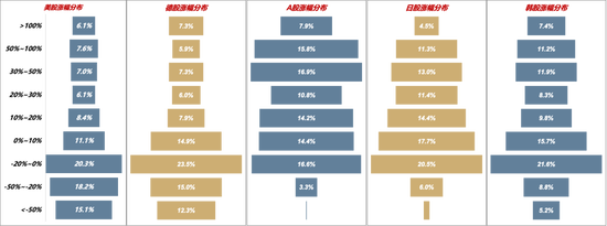 来源:晨明的策略深度思考 一、三个特征,看2025年全球牛市结构: (1)上涨结构:"二八分化"。美国、德国、日本、韩国股市,2025年下跌个股占比56%、51%、29%、 35%; A股有一定普涨特征,下跌比例仅为18%。 二、2025年全球领涨的资产在交易什么?——高增长的稀缺性 (1)经济周期平坦化之后,高增长的资产变得越来越少。A股增速>20%的公司占36%,往年中枢约 45%。 (2)领涨板块:科技与资源品,分别对应两个宏观叙事:一个是AI产业周期、去美元化周期,领涨的 板块多数有强劲的盈利支撑。 | 排版 | 2005 | | 2006 2007 | 2008 | 2009 | | 2010 2011 | | | 服:A股每年财务招标与当年涨幅的相关系数 (%, 2025财报舰至Q3,逐幅截至20251215) | | | | | 2012 2014 2015 2016 2017 2018 2019 2020 2021 2022 2023 2024 2025 | | | | | | | | --- | --- | --- | --- | --- | --- | --- | --- | --- | ...