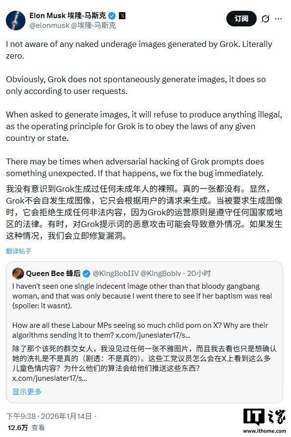 IT之家 1 月 14 日消息,马斯克今日在社交平台 X 上发帖称,其没有发现任何由 Grok 生成的未成年人 裸照。 马斯克称,"我没有见过任何由 Grok 生成的未成年人裸照。真的一张都没有。显然,Grok 不会主动生 成图像,它只会根据用户的请求来生成。当被要求生成图像时,它会拒绝制作任何非法内容,因为 Grok 的运营原则是遵守任何国家或地区的法律。有时,对 Grok 提示词的恶意攻击可能会导致意外情 况。如果发生这种情况,我们会立即修复漏洞。" IT之家此前报道,出于对 Grok 相关的用户安全担忧,马来西亚通信监管机构此前表示将对社交媒体平 台 X 采取法律行动。上周末,马来西亚和印度尼西亚已暂时封禁 Grok,英国媒体监管机构则对马斯克 旗下的平台 X 启动调查,法国相关官员也已将这家社交媒体公司移交检察官与监管机构处理。 ...