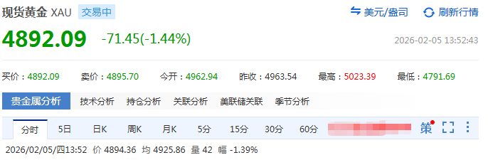 国金证券研报分析称, 金银市场将更加波谲云诡。虽然美元信用等长周期逻辑没有改变,但其背后的 资金流动,资产之间的偏好切换和杠杆交易却从未停歇。随着时间的推移,全球"黑天鹅"事件频发引起 阶段式风险偏好降低,美国再通胀压力抬头引发降息预期收紧以及AI广义成本的传导显著加快,三者 可能在某个时刻面临共振;金银的历史级别波动也可能在其他大类资产身上发生。 对于这轮"过山车"行情,上海金融与发展实验室首席专家、主任曾刚认为,"整个2月份,更可能是冲高 以后,震荡回落"。另有分析人士判断, 2月份接下来的金价更可能以震荡为主。目前只是大跌之后的 反弹而不是反转,反弹之后还可能阴跌。 基于风险考虑,该分析人士建议 投资者尽量避免持仓过节,对2月份贵金属行情需持谨慎态度。 监制:王薇薇 审核:于浩 有机构表示,当前,贵金属市场情绪仍不稳定,高波动性可能会持续一段时间。 | 现货番金 XAU 交易中 | | | | | | ラ 美元/盎司 ○ 刷新行情 | | --- | --- | --- | --- | --- | --- | --- | | 4892.09 -71.45(-1.44%) | | | | | | 2026 ...