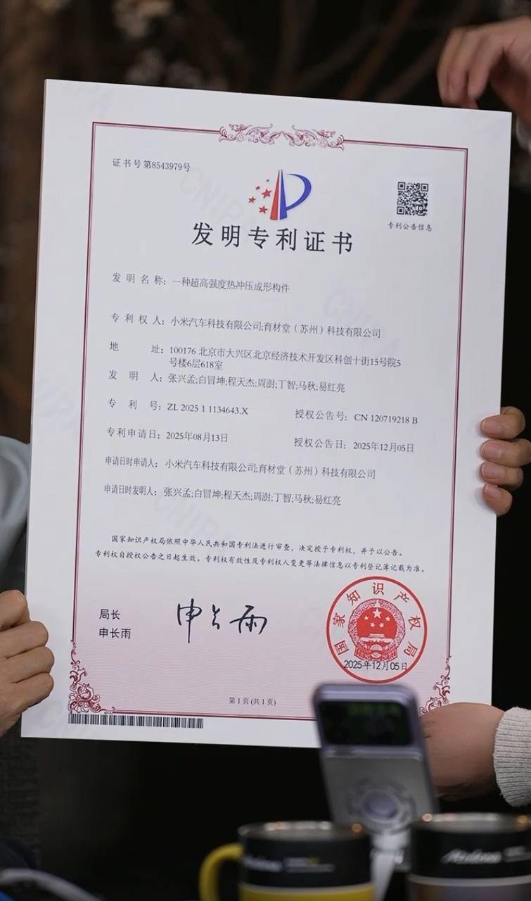 雷军晒2200Mpa超强钢发明专利证书