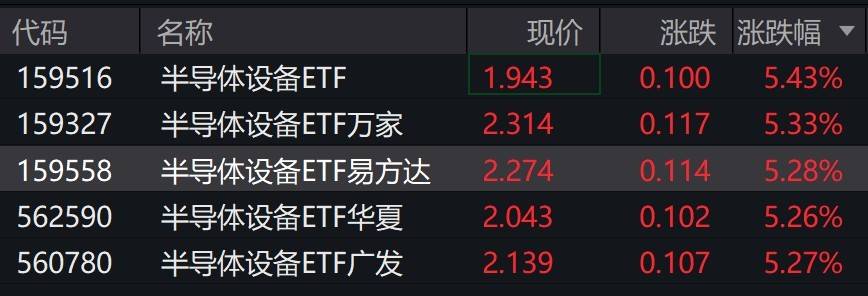 半导体概念股走强,拓荆科技涨超11%,沪硅产业、芯源微涨超6%,中微公司、华海清科涨超5%。 每日经济新闻 | 代码 | 名称 | 现价 | | 涨跌 涨跌幅 ▼ | | --- | --- | --- | --- | --- | | 159516 | 半导体设备ETF | 1.943 | 0.100 | 5.43% | | 159327 | 半导体设备ETF万家 | 2.314 | 0.117 | 5.33% | | 159558 | 半导体设备ETF易方达 | 2.274 | 0.114 | 5.28% | | 562590 | 半导体设备ETF华夏 | 2.043 | 0.102 | 5.26% | | 560780 | 半导体设备ETF广发 | 2.139 | 0.107 | 5.27% | 有分析表示,在AI浪潮和国产化大背景下,国内先进产线未来扩产需求持续存在,半导体设备作为晶圆代工扩张的基石, 同时是实现产业链自主可控的重要环节,国产半导体设备企业有望迎来发展机遇。 受盘面影响,半导体设备相关ETF涨超5%。 ...