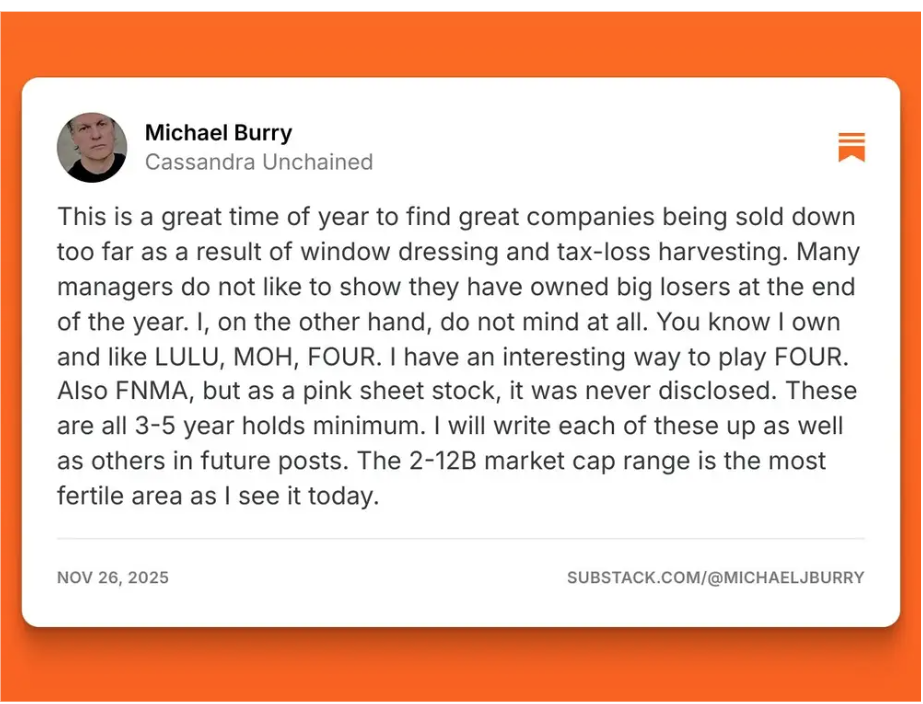 AI播客:换个方式听新闻 下载mp3 音频由扣子空间生成 近日频繁攻击AI热潮的迈克尔・伯里 (Michael Burry)已挣脱金融监管的枷锁,正充分利用新获得的自由分享他最喜爱的股票。 这位电影《大空头》的原型人物本月关闭了面向外部资金的对冲基金,称自己感到被SEC规则"封住了嘴",并希望通过他新创办的 Substack平台自由发声,这个平台恰如其分地命名为"被解放的卡桑德拉"(Cassandra Unchained)。 "你们知道,我持有并喜欢露露乐蒙(LULU)、莫利纳医疗(MOH)、Shift4 Payments(FOUR),"伯里在周三的一篇文章中写 道,"我还持有联邦国民抵押贷款协会(FNMA,也称房地美),但作为粉单市场股票,它从未被披露过。这些都是至少3-5年的持有标 的。我将在未来的文章中详细分析这些以及其他股票。我认为目前200亿-1200亿美元市值区间是最肥沃的投资领域。" 露露乐蒙是一家运动服饰零售商,以其高端瑜伽裤闻名。莫利纳主要为低收入和老年美国人提供经济实惠的医疗保险和医疗服务。Shift4 Payments是一家金融科技公司,为酒店、餐厅、体育场馆和在线零售商等提供支付处理和 ...