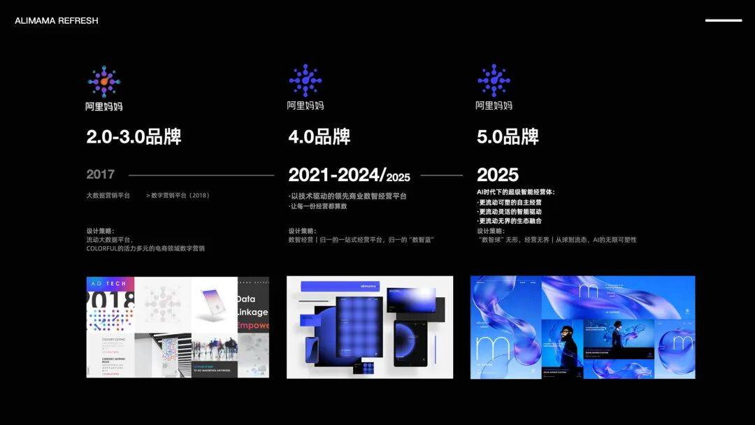 伴随阿里妈妈不断拓展电商生态边界,生成式AI广泛重构各领域,经营走向新阶段—生成式经营。 在2025年9月,阿里妈妈年度峰会发布全新的超级经营智能体,万相台AI无界重磅升级,发布基于全新视觉语言的万相台AI无界升级片,这是我们在AI电 商时代,给到商家经营的"新"答案。 这是一个"更聪明、更全能、更可靠"的超级经营智能体,也意味着品牌即将迎来更年轻、更活力、流动开放的品牌面貌。 阿里妈妈万相台AI无界升级片 阿里妈妈品牌演绎片 回顾上一阶段(2021年),上一轮升级聚焦"数智化"概念,以"圆·点"图形和"数智蓝"确立清晰、专业、可识别的品牌形象,回应了营销数字化转型的需 求。 随着AI 技术全面融入阿里妈妈产品体系,全域流量可运营、全站推流量撬动力变大、经营多目标场景、AI经营全链路提效、AIGC创意生成在营销领域的 全面渗透等;营销进入"智能共创"时代,强调自由响应、聪明个性化,灵动创造。 品牌需从"规则有序"走向"有机生长",无固定边界、可聚合可分散、随数据流动而变形;体现 AI 的流动性、演化性与创造力。 保留"数智蓝"作为主色,但引入渐变透明度、光效层次、动态色温:蓝不再只是"科技冷色",而是带有温度 ...