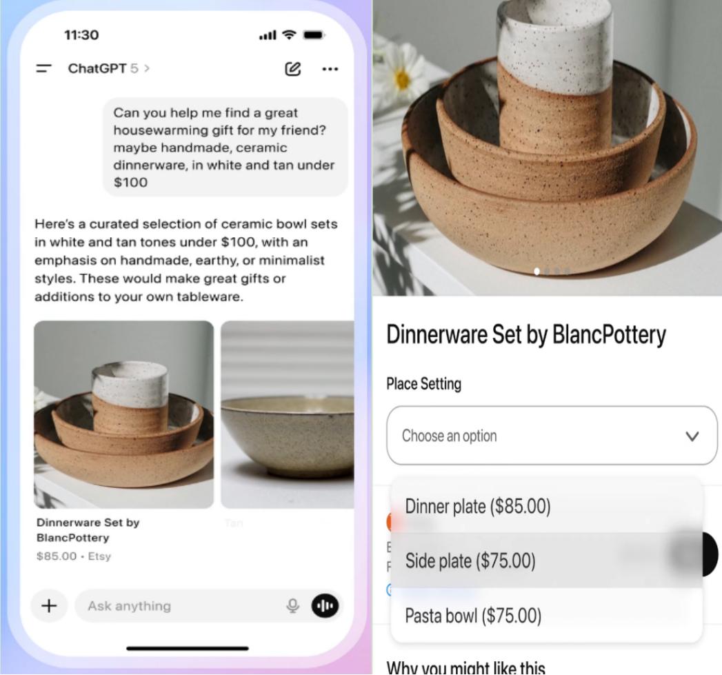 近日,ChatGPT搞了一个大动作,接入多个电商平台,允许用户在ChatGPT站内完成购物,无需像之前那样跳转到第三方购物网站。 这意味着,拥有8亿活跃用户ChatGPT,,不再仅仅是一个"信息入口",同时也是一个电商购物的入口。 这对于亚马逊、eBay、Shopify以及广大跨境 电商卖家来说,是一个巨大的行业变化。 01.ChatGPT的电商生意经 9月29日,ChatGPT上线了 Instant Checkout(即时结账/支付),接入Esty、Shopify两家平台,朝电商业务迈进了更加实质的一步。 通过"即时结账",用户可以向ChatGPT提出非常个性化的购物需求,然后由其在Etsy、Shopify平台海量SKU中查找、筛选适合的商品,并推荐过来。 用户的购买,完全在ChatGPT站内完成,无需跳转到第三方网站或App,整个过程非常流畅。 Open AI(ChatGPT的母公司)演示了整个购物过程。用户向ChatGPT提出购物需求:"朋友乔迁,帮忙选一份礼物。手工制作的、陶瓷材质的餐具就 不错,最好是白棕配色,预算在100 美元以内。 "ChatGPT经过一番搜索、筛选、匹配之后,给用户推荐了一件陶 ...