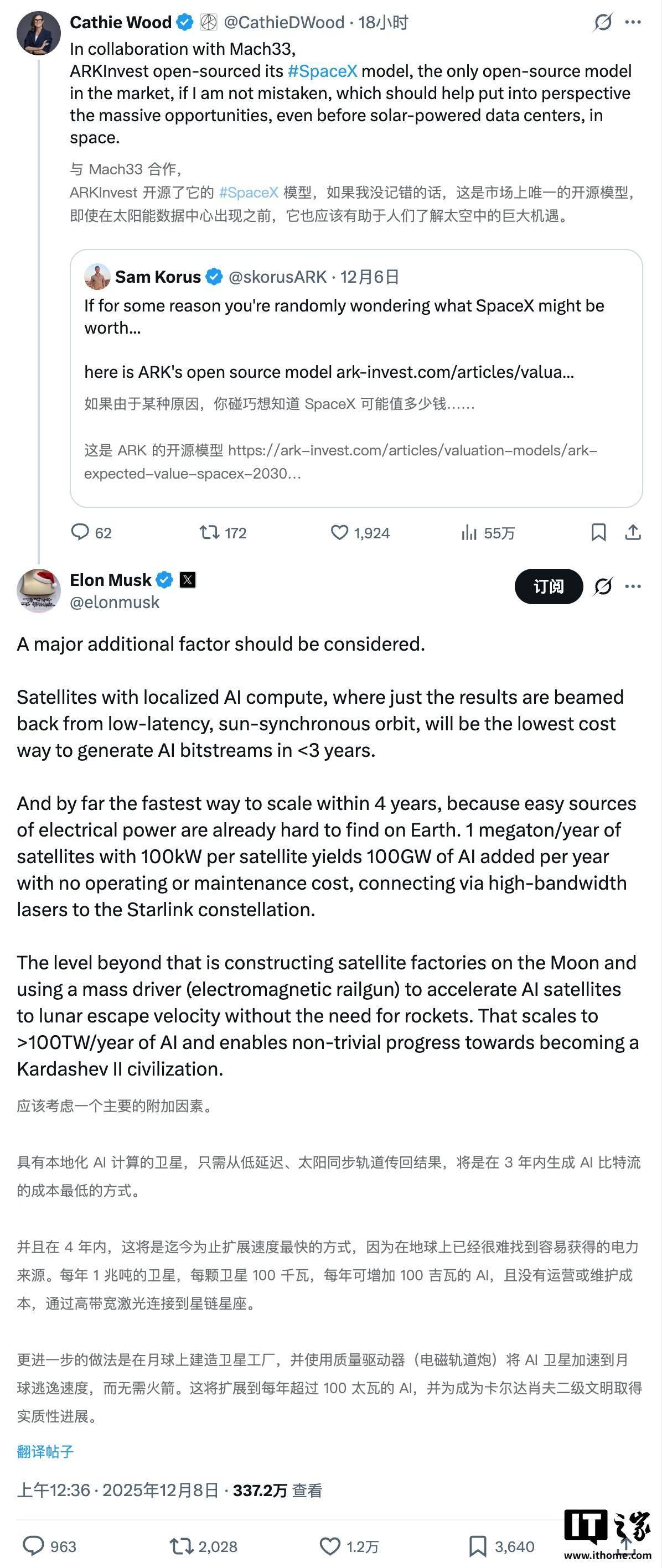 IT之家 12 月 8 日消息,北京时间今天凌晨,马斯克在 X 平台发文称,具有本地化 AI 计算的卫星,只需从低延迟、太阳同步轨道传回结果,将是 3 年内生 成 AI 比特流的成本最低的方式、4 年内扩展速度最快的方式。 马斯克进一步说,在地球上已经很难找到容易获得的电力来源,每年发射 1 百万吨级的卫星,每颗卫星配备 100kW 的功率,即可每年新增 100 吉瓦的 AI 算 力,且无需任何运营或维护成本。"更进一步的做法是在月球上建造卫星工厂,并使用质量驱动器(电磁轨道炮)将 AI 卫星加速到月球逃逸速度,而无需火 箭。最终将扩展到每年超过 100 太瓦的 AI 算力,并为成为卡尔达肖夫二级文明取得实质性进展。" IT之家发现,马斯克在另一则帖子中还提到,一旦月球上有了工厂、机器人和大规模驱动器,从而使整个循环闭合,该系统可能会脱离传统货币,并以瓦特 和吨为单位自主运行。 不久前的 11 月,马斯克曾预测,得益于"免费"的太阳能和便捷的辐射冷却,未来 4~5 年内,在太空部署和运行大规模 AI 系统的成本可能比在地球上运行同 类系统更具成本效益。 马斯克详细阐述了地球的局限性。他强调,随着 AI 计算集 ...