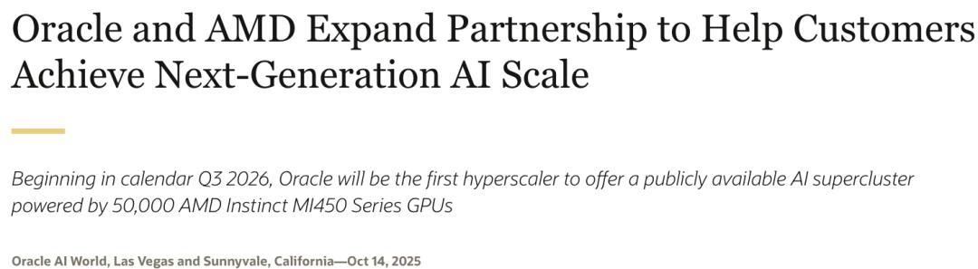 英伟达主导的AI算力生态,正面临一场AMD「5万颗AI芯片大单」所带来的挑战! 刚刚,Oracle官宣将自2026年第三季度起,将在其OCI首期部署5万颗AMD Instinct™ MI450系列GPU,构建AI超级集群,并将于2027年及以后持续扩展。 此次合作旨在将AMD Instinct GPU平台的算力直接提供给OCI客户。 AMD首席执行官苏姿丰(Lisa Su) 这一消息延续了Oracle与AMD在AI加速领域的紧密合作——两者正在构建新的AI算力生态。 资本市场的积极反馈,也体现出业界对AMD最新一代加速架构的信心。 AMD与Oracle宣布合作后,AMD股价走强,盘中/收盘涨幅在约0.8%–3%之间(不同口径)。 MI450 AI时代的「美丽之作」 苏姿丰在社交媒体上,将搭载了Instinct MI450系列GPU的Helios称为「美丽之作」,表示非常高兴将其推向市场。 AMD Instinct MI450系列GPU非常适合运行先进大模型、生成式AI以及高性能计算任务。 部署在OCI上的MI450 GPU具有性能、架构、CPU、安全、互联、软件生态与扩展性等诸多亮点: 性能全面提升 MI45 ...