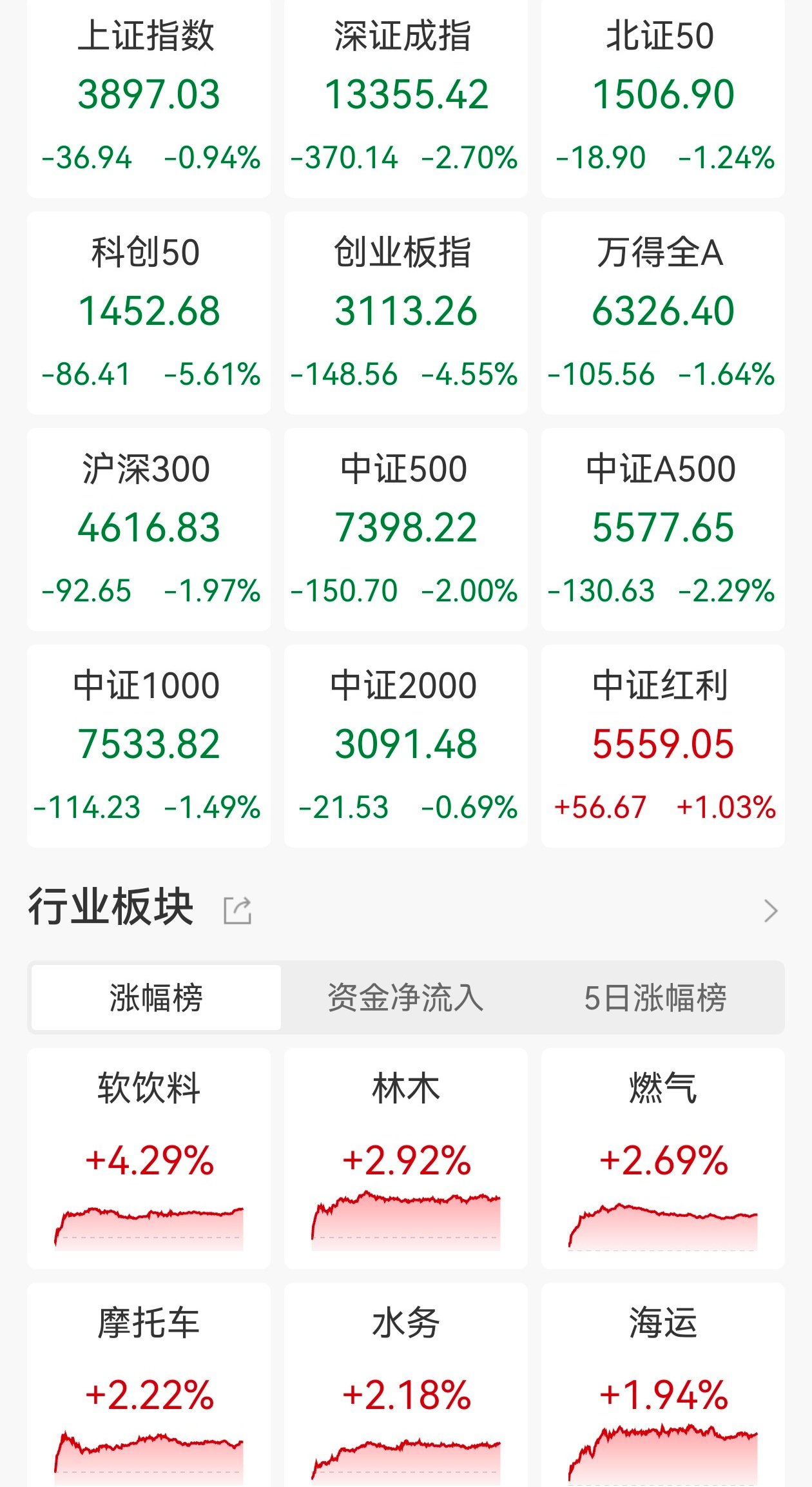 今日A股主要指数集体大跌,沪指跌破3900点;截至收盘,沪指跌0.94%报3897点,深证成指跌2.7%,创业板指跌4.55%,科创50指数跌5.61%。全市场成交 额2.53万亿元,较前一交易日缩量1377亿元,超2700股上涨,超2500股下跌。 | 涨幅榜 | 资金净流入 | 5日涨幅* | | --- | --- | --- | | 软饮料 | 林木 | 燃气 | | +4.29% | +2.92% | +2.699 | | 摩托车 | 水务 | 海运 | | +2.22% | +2.18% | +1.949 | 盘面上,电池股重挫,固态电池、刀片电池方向领跌,璞泰来、上海洗霸等多股跌停;多股两融折算率调整为0,半导体板块大跌,东芯股份、晶合集成等 多股跌逾10%;贵金属板块回调,西部黄金跌停;CPO概念走低,德科立领跌;AI芯片、汽车芯片、星闪概念及复合集流体等板块跌幅居前。另外,燃气股 走强,大众公用、洪通燃气双双涨停;工信部等6部门联合助力"建材行业稳增长",水泥建材板块走高,华新水泥涨停;煤炭板块拉升,大有能源涨停;美 容护理、公用事业及航运港口等板块涨幅居前。(格隆汇) | 上证指数 | 深 ...
