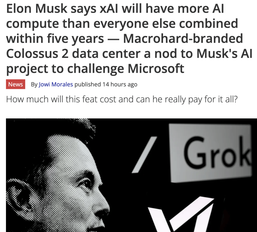 马斯克豪赌算力:xAI五年欲超全球总和,Colossus 2成烧钱引擎