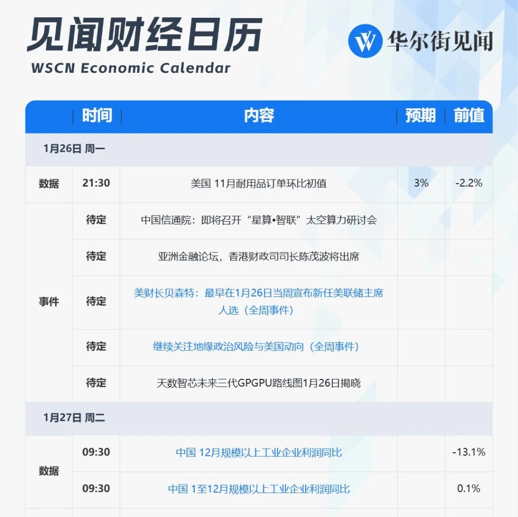 · 多购多惠 | 低至 见闻奶经言示 WSCN Economic Calendar | 时间 | | 内容 | 预期 前值 | | | --- | --- | --- | --- | --- | | 1月26日 周一 | | | | | | 数据 | 21:30 待定 | 美国 11月耐用品订单环比初值 中国信通院:即将召开"星算·智联"太空算力研讨会 | 3% -2.2% | | | 待定 | | 亚洲金融论坛,香港财政司司长陈茂波将出席 | | | | 事件 | 待定 | 美财长贝森特:最早在1月26日当周宣布新任美联储主席 人选(全周事件) | | | | 待定 | | 继续关注地缘政治风险与美国动向(全周事件) | | | | 待定 | | 天数智芯未来三代GPGPU略线图1月26日揭晓 | | | | 1月27日 周二 | | | | | | 数据 | 09:30 | 中国 12月规模以上工业企业利润同比 | | -13.1% | | 09:30 | | 中国 1至12月规模以上工业企业利润同比 | | 0.1% | | 事件 | 待定 | 欧盟-印度峰会,或宣布贸易协定 | | | 华尔街见闻 | ...