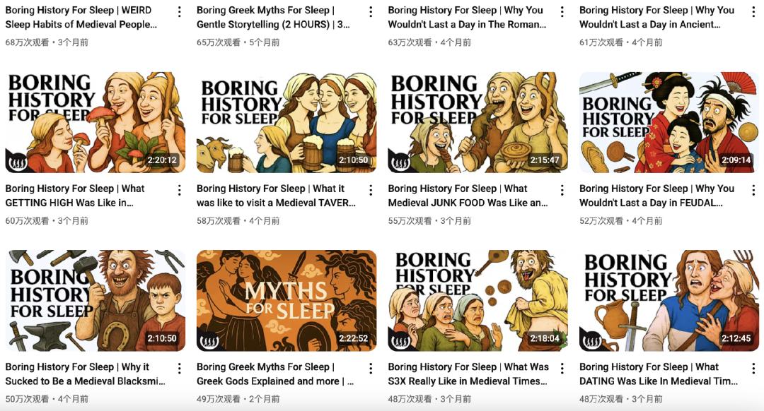在几小时的超长视频赛道中,AI也有了一席之地。 视频里,AI变声成温柔低音炮,贴心地提醒观众"调暗灯光、放松心情,准备好进入今晚的时空之旅"。他以平静的语调讲述着"中世纪的醉酒生活是什么 样的"、"中世纪常见疾病的奇特疗法"、"维多利亚时代的育儿方法"等故事。 旁白声配合着柴火燃烧的背景音,大段大段的历史就这样被娓娓道来,其催眠效果不亚于上了一节大学历史课。 其中,一条长达2小时的视频在YouTube上播放量已超388万,评论超过1万条。 视频发布者"Sleepless Historian"自今年4月底起开始上传AI历史故事类长视频,据社交媒体分析工具Social Blade显示,仅一个月该账号便涨粉超35万,目 前订阅数已突破62万。 乍一看,视频声音和画面几乎毫无破绽,都不会让人觉得是AI生成的,但快到视频结尾时,AI的声音突然开始出现了"故障",不仅持续发出"eeeeeee"的 音,还会美音、英音反复切换。 不仅如此,我们观察到"Historian Sleepy""Sleepless Historian""The Snoozetorian""Dreamoria""梦真侍郎"等账号,同样以不同时期的历史故 ...