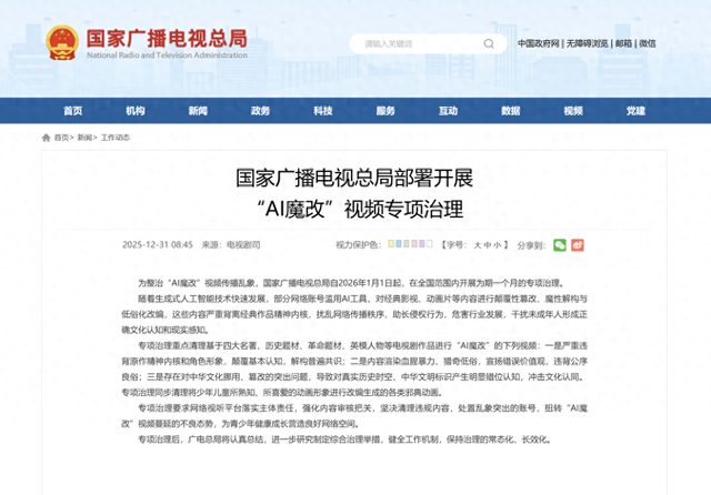 Core Viewpoint - The National Radio and Television Administration will launch a month-long special governance action starting January 1, 2026, to clean up short video works that maliciously adapt and deconstruct classic film and television content using AI technology [1] Group 1: Governance Action - The action aims to send a clear message that the application of technology should not become a lawless area for arbitrarily deconstructing classics, distorting history, or misrepresenting cultural understanding [1] - There is a significant concern regarding "AI magic modifications" leading to cultural appropriation and distortion, which can create a misalignment in the understanding of real historical contexts and Chinese civilization [1] Group 2: Cultural Impact - Recent trends show that some youth are forming negative impressions of traditional Chinese culture, such as believing that "foreign versions of the Classic of Mountains and Seas" are superior, without having a proper understanding of the original work [1] - The wave of artificial intelligence is changing the way information is produced and disseminated, providing greater creative space and possibilities, but also spreading both positive and negative value orientations [1] Group 3: Long-term Management - There is a need for not only special governance of "AI magic modification" videos but also for regular management to establish a long-term regulatory mechanism that includes cross-platform collaboration, unified technical review standards, and clear accountability [2]