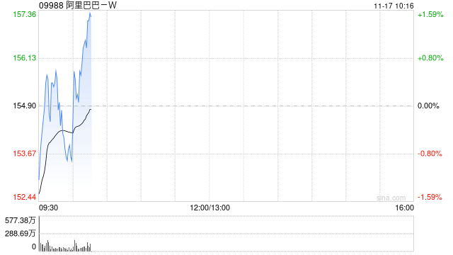 | 09988 阿里巴巴-W | | | | --- | --- | --- | | 156.700↑+1.800 +1.16% | | 交易中 11/17 10:10 | | * 2 × 5 × 5 × | | ● 快捷交易 | | 最高价 156.700 | 开盘价 152.300 | 成交量 3998.53万 | | 最低价 152.100 | 昨收价 154.900 | 成交额 61.72亿 | | 平均价 154.361 | 市盈率TTM 18.39 | 总市值 2.99万亿 (m) | | 振 幅 2.97% | 市盈率(静) 21.32 | 总股本 190.89亿 | | 换手率 0.21% | 市净率 2.691 | 流通值 2.99万亿 | | 52周景高 186,200 | 委 比 15.60% | 流通股 190.89亿 | | 52周最低 75.399 | 量 比 3.36 | 每 手 100股 | | 开中最高 304.852 | 股息TTM 1.961 | 股息率TTM 1.250% | | 历史最低 55.702 | 股息LFY 1.961 | 股息率LFY 1.251% | 消 ...