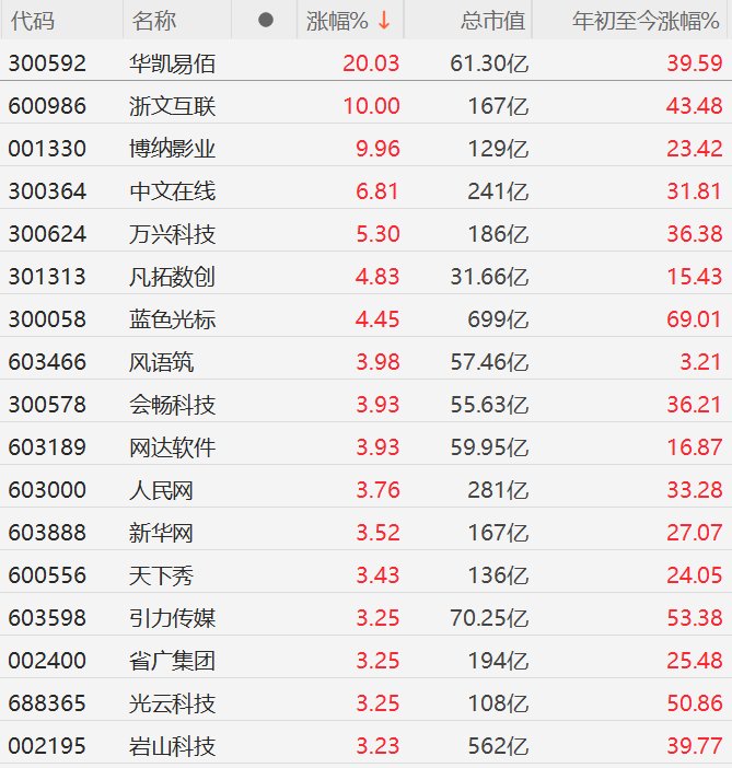 1月22日,A股市场AIGC概念股普涨,其中,华凯易佰20CM涨停,浙文互联、博纳影业10CM涨停,中 文在线涨超6%,万兴科技涨超5%,蓝色光标、凡拓数创涨超4%,天下秀、会畅科技、网达软件、人民 网、风语筑、新华网、引力传媒涨超3%。 消息面上,OpenAI已通知多位广告主计划于2月初上线ChatGPT广告服务,初期按展示次数计费,并在 免费及低价订阅用户中测试投放。 | 代码 | 名称 | 涨幅% ↓ | 总市值 | 年初至今涨幅%。 | | --- | --- | --- | --- | --- | | 300592 | 华凯易佰 | 20.03 | 61.30亿 | 39.59 | | 600986 | 浙文互联 | 10.00 | 167亿 | 43.48 | | 001330 | 博纳影业 | 9.96 | 129亿 | 23.42 | | 300364 | 中文在线 | 6.81 | 241亿 | 31.81 | | 300624 | 万兴科技 | 5.30 | 186亿 | 36.38 | | 301313 | 凡拓数创 | 4.83 | 31.66亿 | 15.43 | | 300058 ...