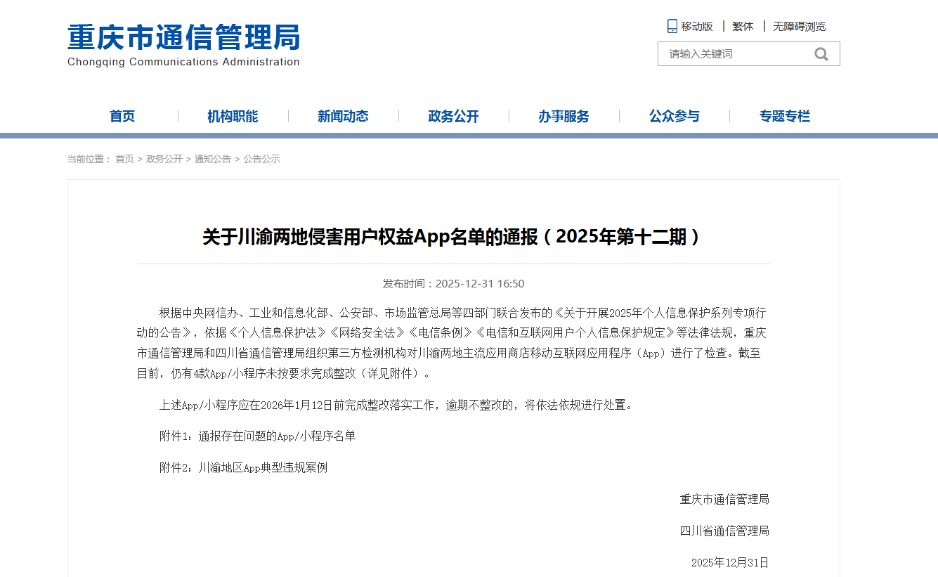 关于川渝两地侵害用户权益App名单的通报(2025年第十二期)