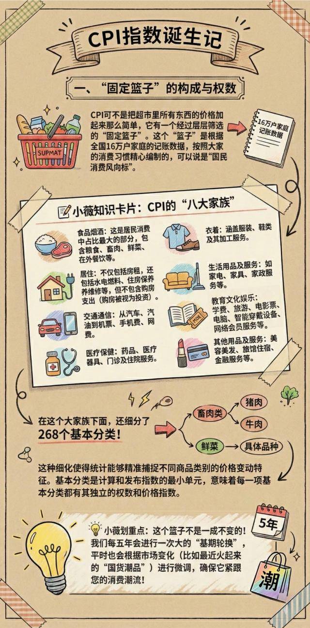 您是否经常在新闻里听到 "CPI同比上涨X%" 是否好奇这个神秘的数字 究竟是如何计算出来的 就带大家独家揭秘 这个牵动亿万人心的"CPI"指数 到底是如何诞生的。 油到机票、手机费、网 网络会员服务等。 其他用品及服务:美 容美发、旅馆住宿。 医疗保健:药品、医疗 金融服务等。 器具、门诊及任院服务。 在这个大家族下面,还细分了 268个基本分类! 这种细化使得统计能够精准捕捉不同商品类别的价格变动特 征。基本分类是计算和发布指数的最小单元,意味着每一项基 本分类都有其独立的权数和价格指数。 小薇划重点:这个篮子不是一成不变的! 我们每五年会进行一次大的"基期轮换" 平时也会根据市场变化(比如最近火起来 的"国货潮品")进行微调,确保它紧跟 您的消费潮流! ● CPI指数诞生记 抽样与网点布局 2 4 CPI数据的来源必须具有广泛的 代表性。统计部门通过多阶段 分层随机抽样,构建起覆盖全 国的调查网络。 电脑、智能穿戴皮 1. 调查市县的抽选(科学抽选) 中城市 ,1 其他地级市 县级市和具 o © O 分层 PPS抽样 系统抽样 23 将全国城镇划分 按人口比例分配 以人均收入排队, 0 为三个层级。 采 ...