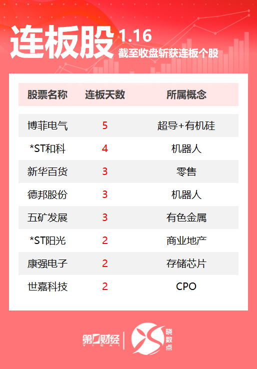 | 王权成 | 1.16 | | | --- | --- | --- | | | | 截至收盘斩获连板个股 | | 股票名称 | 连板天数 | 所属概念 | | 博菲电气 | 5 | 超导+有机硅 | | *ST和科 | 4 | 机器人 | | 新华百货 | 3 | 零售 | | 德邦股份 | 3 | 机器人 | | 五矿发展 | 3 | 有色金属 | | *ST阳光 | 2 | 商业地产 | | 康强电子 | 2 | 存储芯片 | | 世嘉科技 | 2 第二师经 | CPO | 1月16日,Wind数据显示,A股市场共计67只个股涨停。其中机器人概念股*ST和科4连板、德邦股份3 连板,存储芯片板块康强电子2连板。一图速览今日连板股>> 机器人概念股*ST和科4连板,存储芯片板块康强电子2连板。一图速览今日连板股>> ...