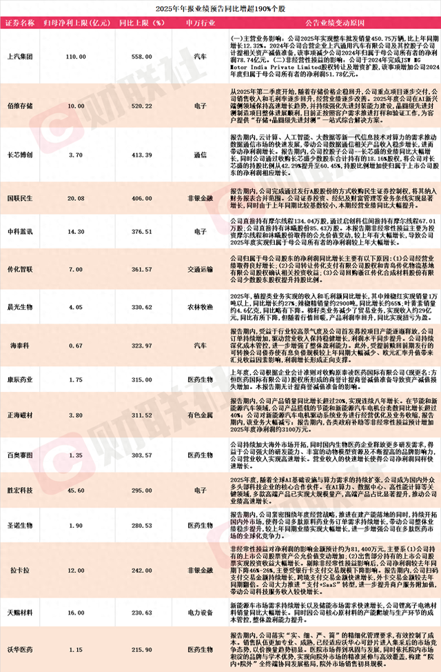 智通财经1月18日讯(编辑 宣林)A股年报行情如火如荼,披露2025年年报业绩预告次日,拉卡拉、山 河药辅20CM涨停,金海通收盘涨停,佰维存储涨超17%。 转自:智通财经 据Choice数据统计,截至发稿,共有366家A股上市公司发布2025年年报预告。包括上汽集团、佰维存 储、长芯博创、国联民生、中科蓝讯、传化智联、晨光生物、海泰科、康辰药业、正海磁材、百奥赛 图、胜宏科技、圣诺生物、拉卡拉、天赐材料、沃华医药(维权)在内的16只个股归母净利同比预增上 限超200%(具体情况见下图)。 | 证券名称 | HB30利上限(V.元) | 同比上限(%) | 2025年年报业绩预告同比增超190%个股 中方行业 | 公告业绩变动原因 | | --- | --- | --- | --- | --- | | | | | | (一)主营业务影响:公司2025年实现整车批发销量450.75万辆,比上年同期 | | | | | | 舞长12.32%。2024年公司合营企业上汽通用汽车有限公司及其控股子公司 | | 上汽集团 | | | | 计提相关资产减值准备,该事项强少公司2024年归属于母公司所有者的净利 | | | ...