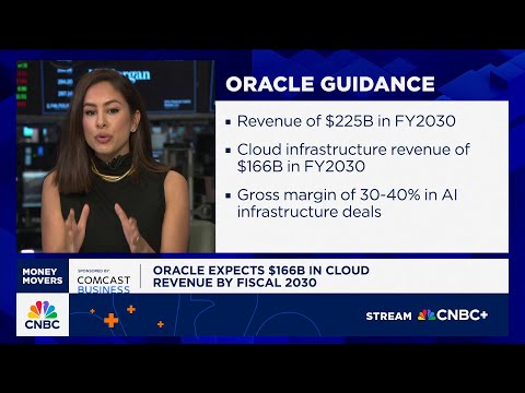 Shares of Oracle continue to slide this morning despite bullish long-term forecasts. At its analyst day yesterday, it said it expects cloud sales of 166 billion. That would be by fiscal year 2030.It also increased its deal backlog. It's now over $500 billion. Both seemingly positives.The stock did move up a bit after those numbers were shared yesterday, but of course you can see down almost 8%. Simma Mod's here at Post 9. she has more on sort of what's going on here.>> So David and Sarah, let's talk about t ...