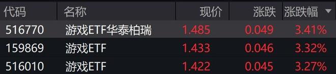 | 代码 | 名称 | 现价 | | 涨跌 涨跌幅 ▼ | | --- | --- | --- | --- | --- | | 516770 | 游戏ETF华泰柏瑞 | 1.485 | 0.049 | 3.41% | | 159869 | 游戏ETF | 1.433 | 0.046 | 3.32% | | 516010 | 游戏ETF | 1.422 | 0.045 | 3.27% | 游戏概念股早盘走高,巨人网络涨超7%,恺英网络涨超5%,三七互娱、吉比特涨超4%。 受盘面影响,游戏ETF涨超3%。 有券商表示,在全球视角下,游戏市场正处于上升周期,不论从营收的角度还是玩家数量角度,在未来 都将保持长期乐观增长态势。另外,DeepSeek强大的生成能力或显著提高游戏开发效率,并可生成更 能满足用户需求的虚拟角色、地图、剧情等内容,丰富游戏玩法,培育付费场景。 ...
