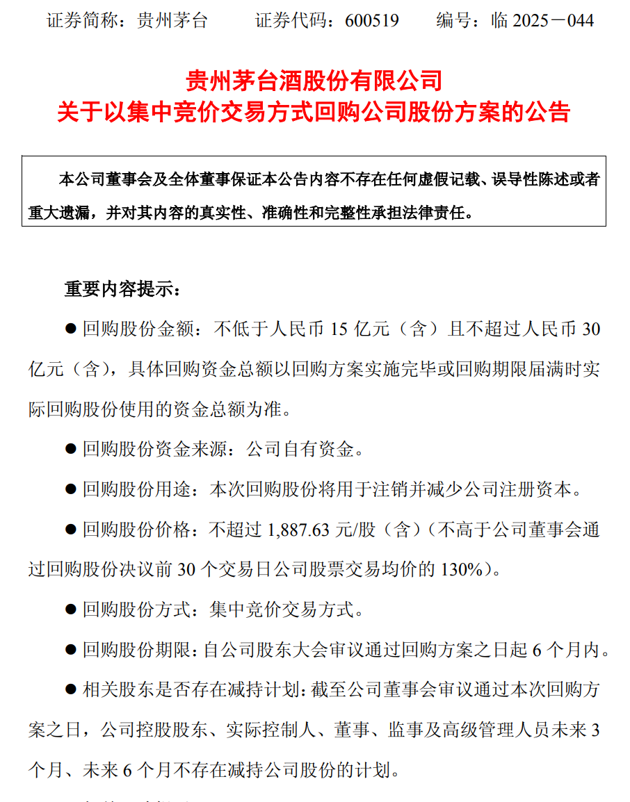 11月5日晚间,贵州茅台(600519)公告称,贵州茅台将启动第二轮回购。公司计划以集中竞价交易方式回购股份,资金总额不低于15亿元 且不超过30亿元,回购价格不超过1887.63元/股。回购的股份将用于注销并减少公司注册资本。 上述公告还显示,截至2025年9月30日,贵州茅台总资产为3047.38亿元,归属于上市公司股东的净资产为2570.70亿元,现金和现金等价物 为1595.02亿元。假设本次回购股份的资金上限30亿元全部使用完毕,回购资金约占公司截至2025年9月末总资产的0.98%、归属于上市公司 股东净资产的1.17%、现金和现金等价物的1.88%。本次回购方案实施完成后,不会对公司日常经营、财务、研发、盈利能力、债务履行能 力、未来发展及维持上市地位等产生重大影响。 而此前贵州茅台就完成了一次回购,8月30日贵州茅台公告称,公司于8月29日回购股份实施完成,实际回购公司股份392.76万股,占公司 总股本的0.3127%,回购均价1527.65元/股,使用资金总额约60亿元(不含交易费用)。根据回购股份方案,回购的392.76万股将全部用于注 销并减少公司注册资本。 除了回购外,11月5日贵州 ...