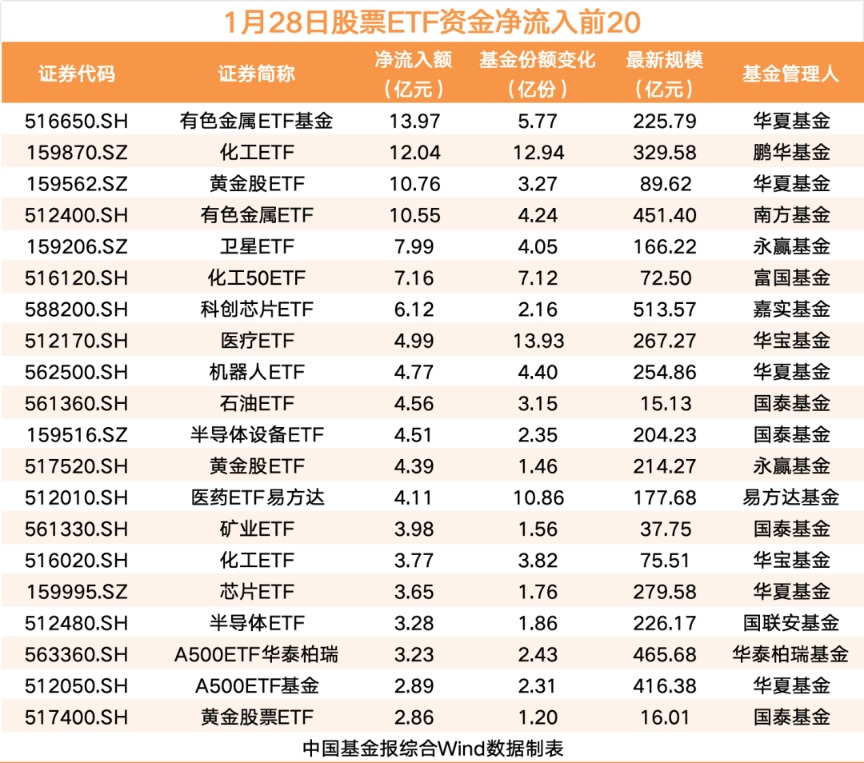 【导读】1月28日股票ETF资金净流出超1300亿元 1月28日,A股三大指数涨跌不一。股票ETF市场上,资金延续净流出态势,当日净流出超1300亿元。 行业主题ETF资金净流入居前 数据显示,截至1月28日,全市场1320只股票ETF(含跨境ETF,下同)总规模为4.3万亿元,基金份额 减少217亿份;根据均价测算,净流出资金为1312.07亿元。 从大类型看,当日行业主题ETF与商品ETF净流入居前,分别达176.86亿元、71.54亿元。指数维度上, 1月28日SGE黄金9999指数产品单日净流入居前,达63.91亿元;从5个交易日角度观测,近期资金流入 SGE黄金9999指数超191亿元。 具体来看,1月28日共有53只ETF资金净流入超1亿元。其中,华夏基金的有色金属ETF基金、鹏华基金 的化工ETF、华夏基金的黄金股ETF位列前三,资金净流入分别为13.97亿元、12.04亿元、10.76亿元。 头部基金公司旗下ETF继续获得资金净流入。易方达基金方面,黄金ETF易方达资金净流入10.8亿元, 医药ETF易方达资金净流入4.11亿元,科创50ETF易方达资金净流入2.4亿元,科创芯片ETF易方达资 ...