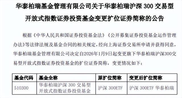 在ETF市场加快迈向规范化、制度化发展的背景下,ETF命名规则进入集中落地阶段,存量产品的规范化调 整正成为行业关注的焦点。 2026年1月7日,华泰柏瑞基金发布公告,旗下沪深300ETF(510300)的场内扩位简称调整为"沪深300ETF华泰 柏瑞",该变更将于1月9日生效。作为全市场管理规模最大的一只ETF,该产品的更名动向也引发了市场的广 泛关注。 分析人士认为,这一调整虽看似细微,却是ETF市场迈向标准化、透明化、投资者友好化的重要标志,也是公 募基金行业响应高质量发展要求、从"规模导向"转向"服务与信任导向"的关键一步。作为市场规模领先、投资 者基础广泛的标杆产品,华泰柏瑞沪深300ETF(510300)主动"亮明身份"的举措,体现了头部机构的责任意识, 也为行业树立了可参照的实践样本。 "巨无霸"ETF正式更名 2026年1月7日,华泰柏瑞基金发布公告,旗下沪深300ETF(510300)的场内扩位简称调整为"沪深300ETF华泰 柏瑞",该变更将于1月9日生效。作为管理规模最大的一只ETF,这一更名动向也引发了市场的广泛关注。 此次更名遵循2025年11月沪深交易所发布的基金业务指南修订要求, ...