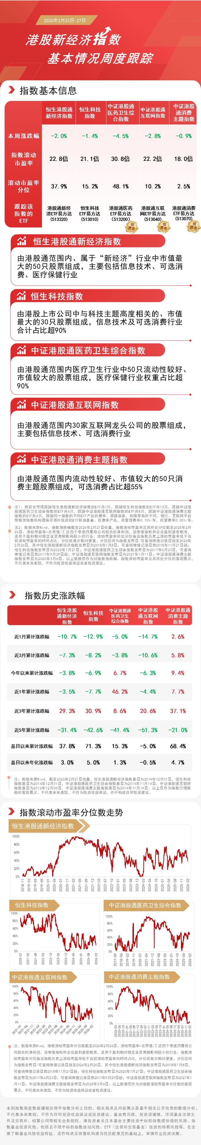 本周,中证港股通消费主题指数下跌0.9%,恒生科技指数下跌1.4%,恒生港股通新经济指数下跌 2.0%,中证港股通互联网指数下跌2.8%,中证港股通医药卫生综合指数下跌4.5%。资金逆势加仓相关 ETF,Wind数据显示,截至昨日,恒生科技ETF易方达(513010)和港股通互联网ETF易方达 (513040)近一月分别获42亿元和13亿元资金净流入。 华泰证券研报称,春节期间港股市场内部分化加大,AI新势力与互联网巨头走势背离,消费数据亮点 尽显但未明显提振板块表现,涨幅依然集中在科技和周期行业。展望来看,短期提示投资者防范指数和 港股通调整日前后相应抢跑个股的波动风险。中期配置上,科技和周期耗材仍是清晰主线。 HJUA / / IIX TE THAT メロHHHUJX小 TJ KEIF 费、医疗保健行业 级课堂中解视课堂共信中 元 由港股通范围内流动性较好、市值较大的50只消 费主题股票组成,可选消费占比超55% 注1:目前全市场跟踪恒生港股通新经济指数的ETF共1只,跟踪恒生科技指数的ETF共13只,跟踪中证港 股通医药卫生综合指数的ETF共4只,跟踪中证港股通互联网指数的ETF共8只,跟踪中证港股通消 ...