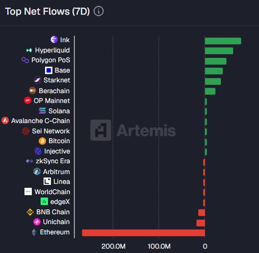 过去 7 天,由 Kraken 支持的 Ethereum L2 网络 Ink 净流入约 8,000 万美元