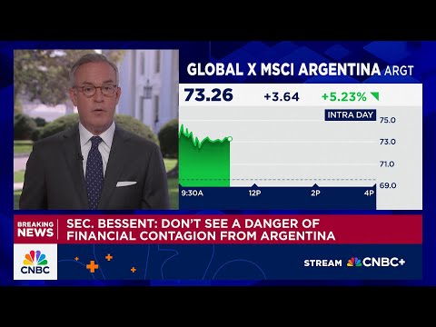 We are getting some breaking news out of Treasury. Let's get over to Aean Jabbers. Morning Aman. Yeah, good morning Carl.I just came from a briefing with Secretary Bessant uh rare briefing on the record uh in his offices talking about a potential US intervention in Argentine financial markets. The Treasury Secretary saying to a small group of reporters just now that the United States is prepared for what he called a large and forceful intervention to stabilize Argentine financial markets, but that the uh ne ...