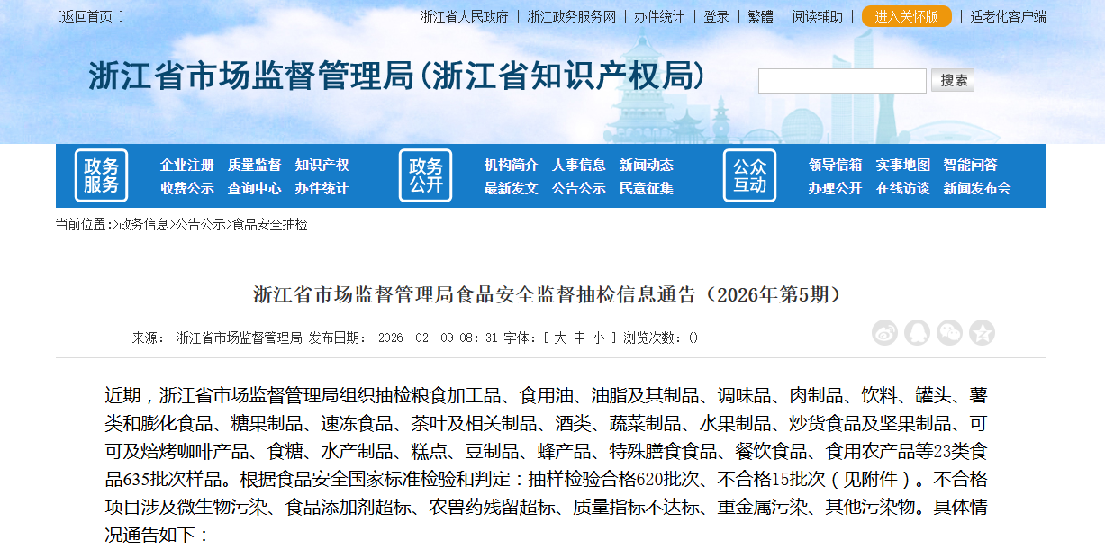 浙江省市场监督管理局食品安全监督抽检信息通告(2026年第5期)