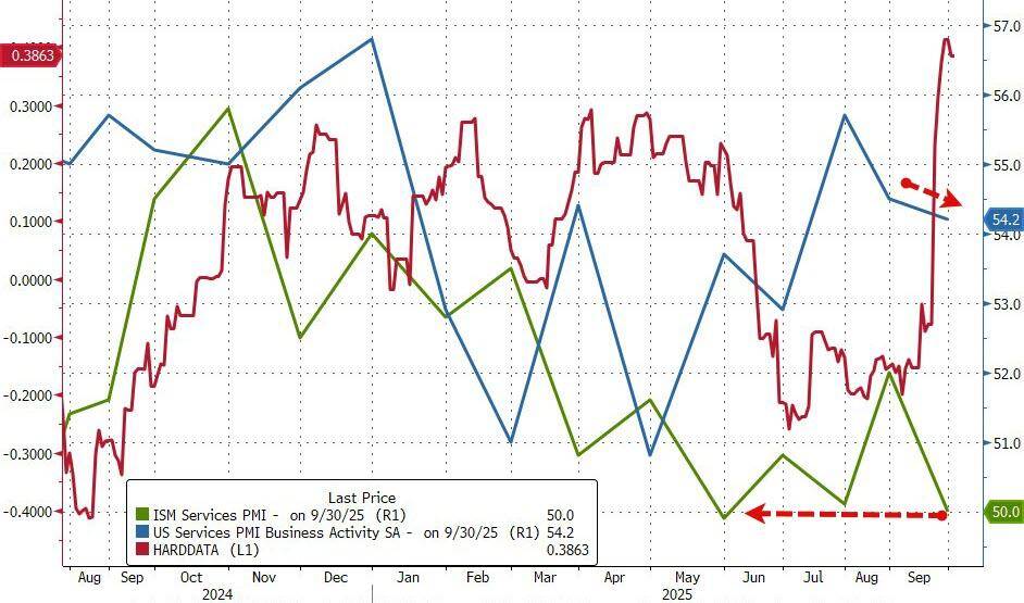 10月3日周五,美国供应管理协会(ISM)公布的数据显示,美国服务业9月陷入停滞。订单和商业活动疲软,就业也连续第四个月萎 缩。 美国9月ISM非制造业指数50,大幅不及预期的51.7,前值52。50为荣枯分水岭。9月ISM服务业PMI低于媒体调查的所有经济学家的预 估。 重要分项指数方面: 数据公布后,美国10年期国债收益率短线震荡于4.10%-4.08%区间,两年期美债收益率在美国ISM服务业PMI发布时跳水至3.54%下 方、日内整体转跌、瞬间又反弹至接近3.555%的水平。 分析指出,作为美国经济最大组成部分的服务业表现令人失望。本周早些时候的一份报告显示,美国ISM制造业PMI连续第七个月收 缩。由于美国政府停摆导致官方数据缺失,经济学家和决策者将更多地依赖ISM调查等私营机构的报告来洞察就业市场和整体经济状 况。 当日稍早公布的另一重要美国PMI数据显示: S&P Global Market Intelligence首席商业经济学家Chris Williamson表示: 9月份服务业增长略有放缓,但整体仍然足够强劲,使得第三季度整体表现令人印象深刻。再加上制造业的持续增长,服 务业活动的扩张表明, ...