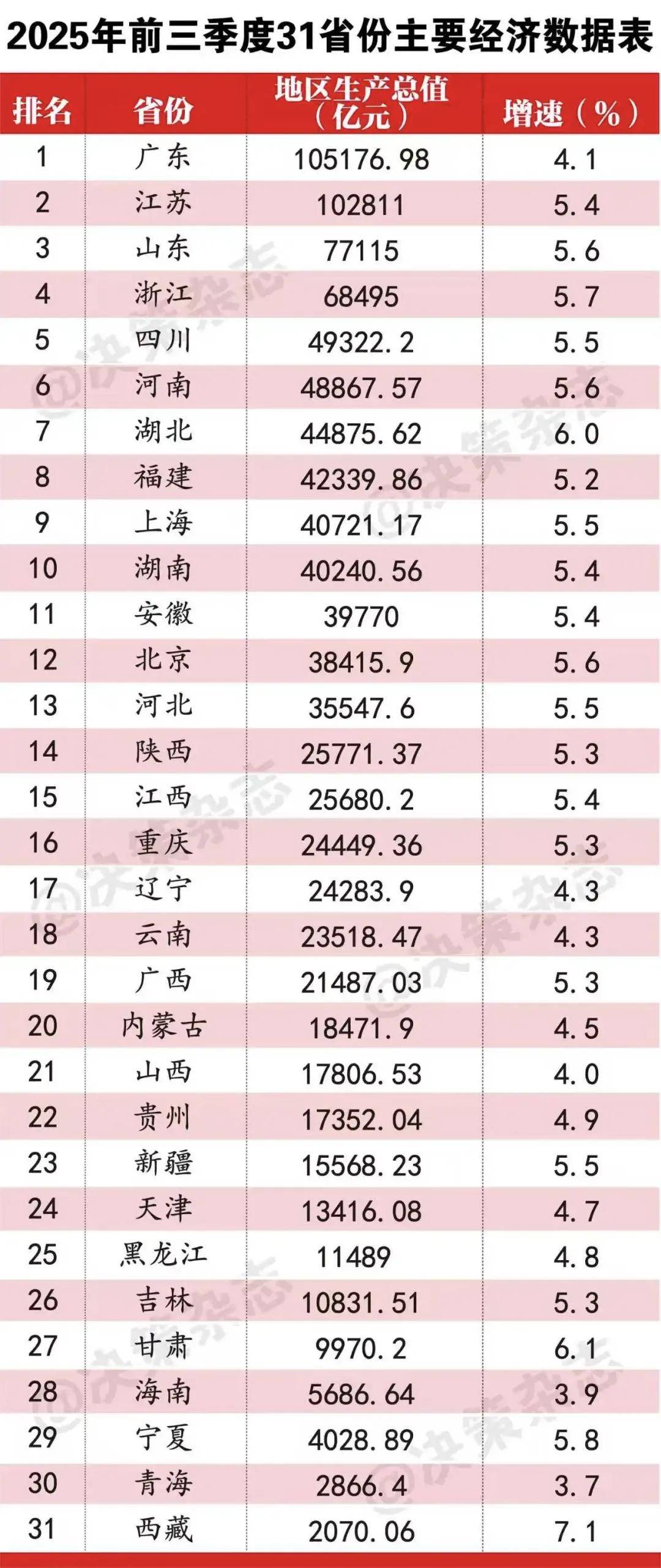 10月31日,31省份2025年经济"三季报"均已出炉。 | 排名 | 省份 | 地区生产总值 | 增速(%) | | --- | --- | --- | --- | | 1 | 广东 | 105176. 98 | 4. 1 | | 2 | 江苏 | 102811 | 5.4 | | 3 | 山东 | 77115 | 5.6 | | ব | 浙江A | 68495 | 5.7 | | 5 | 四川 | 49322. 2 | 5.5 | | 5 | 河南 | 48867. 57 | 5.6 - | | 7 | 湖北 | 44875. 62 | 6.0 | | 8 | 福建 | 42339.86 | 5.2 | | 0 | 上海 | 40721. 17 | 5.5 | | 10 | 湖南 | 40240. 56 | 5.4 | | 11 | 安徽 | 39770 | 5.4 | | 12 | 北京 | 38415. 9 | 5.6 | | 13 | 河北 | 35547. 6 | 5.5 | | 14 | 陕西 | 25771. 37 | 5.3 | | 15 | 江西 | 25680. 2 | 5.4 | | ...
