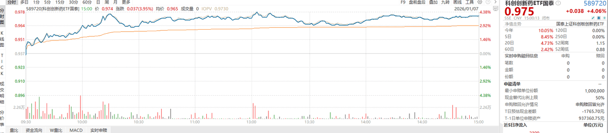 创新药板块表现亮眼。科创创新药ETF(589720)大涨4.06%,创新药ETF国泰(517110)涨2.80%。 创新药板块经历回调后性价比显现,伴随着海外龙头已上市小核酸药物展现出较大商业化潜力,海内外 小核酸在研管线数据的密集发布,小核酸技术路径逐渐走向成熟。本周瑞博生物即将登陆港股市场,有 望进一步催化市场情绪。 展望后市,预计GLP-1更多适应症突破、小核酸药物、ADC多点突破值得期待;短期可关注与脑机接 口、小核酸等主题共振机会;产业层面:1月中旬JPM会议、5月ASCO年会等关键会议或密集披露临床 数据,业绩期商业化公司表现值得期待。若持续有高质量数据读出催化,可能驱动资金回流。可以关注 聚焦科创板创新药企业,覆盖生物制药、化学制药等领域,代表创新药产业基本面景气度的科创创新药 ETF(589720)和聚焦于沪港深三地市场中从事化学、生物创新药研发及相关产业链服务的创新药ETF 国泰(517110)。 风险提示: 来源:WIND 消息面上,Arrowhead Pharmaceuticals于2026年1月6日公布了其两款基于RNAi技术的减重药物(ARO- INHBE和ARO-ALK7)的1/2 ...