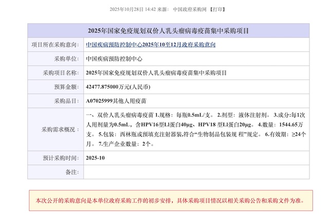 2025.10. 29 本文字数:768,阅读时长大约1分钟 作者 | 第一财经 林志吟 随着HPV疫苗纳入国家免疫规划,10月28日下午,中国政府采购网公布了2025年国家免疫规划双价 人乳头瘤病毒疫苗(即二价HPV疫苗)集中采购项目,预算金额约4.25亿元,数量是1544.65万,这 意味着单支价格不超过27.5元。 这次的采购单位是中国疾病预防控制中心。 今年9月11日,在国新办"高质量完成'十四五'规划"系列主题新闻发布会上,国家疾控局局长沈洪兵 表示,今年国家将推出面向适龄女生的HPV疫苗接种服务,并且将HPV疫苗纳入国家免疫规划,保 护女性的健康。 | | 2025年国家免疫规划双价人乳头瘤病毒疫苗集中采购项目 | | --- | --- | | 项目所在采购意向: | 中国疾病预防控制中心2025年10至12月政府采购意向 | | 采购单位: | 中国疾病预防控制中心 | | 采购项目名称: | 2025年国家免疫规划双价人乳头瘤病毒疫苗集中采购项目 | | 预算金额: | 42477.875000万元(人民币) | | 采购品目: | A07025999其他人用疫苗 | | 采购需求概况: | ...