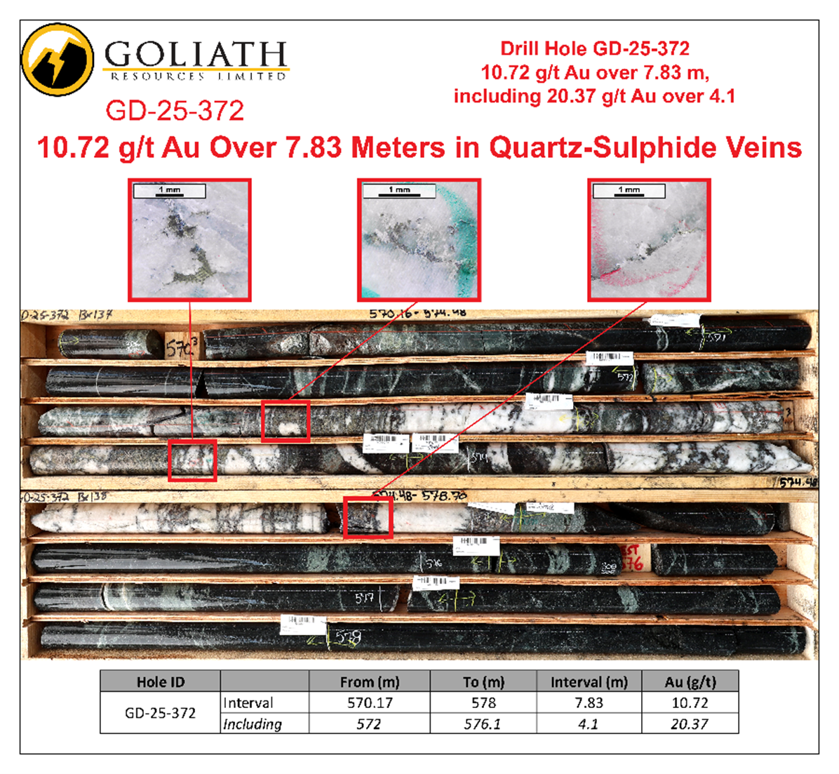 Core Insights - Goliath Resources Limited announced significant assay results from its 2025 drill program at the Surebet Discovery, with drill hole GD-25-372 intersecting 10.72 g/t Au over 7.83 meters, including 20.37 g/t Au over 4.10 meters [8][11] - The drilling campaign has confirmed high-grade gold mineralization across multiple drill holes, with 100% of completed holes intersecting substantial quartz-sulphide mineralization and 76% containing visible gold to the naked eye [9][23] - The Surebet Discovery has demonstrated excellent continuity and potential for further expansion, with ongoing assays pending for 84 holes, of which 66 contain visible gold [9][10] Company Overview - Goliath Resources is focused on exploring precious metals in the Golden Triangle of British Columbia, controlling the Golddigger Property, which spans 91,518 hectares [18][26] - The company has executed a fully funded drill campaign in 2025 totaling 64,364 meters, aimed at expanding the geometry of the Surebet Discovery [14][26] - Goliath has increased its land package significantly, now controlling 56 kilometers of the Red Line geologic trend, enhancing its discovery potential [23][26] Drilling Results - The 2025 drilling program has yielded high-grade gold intercepts, with notable results including GD-25-373 intersecting 6.30 g/t Au over 7.50 meters and GD-25-324 intersecting 6.11 g/t Au over 7.65 meters [11][13] - A total of 30 holes in the Surebet system have reported intervals greater than 1 oz/t Au (31.1 g/t Au), indicating strong mineralization [10][14] - The drilling has confirmed three distinct rock packages at the Surebet Discovery, each containing substantial amounts of visible gold [14][15] Geological Insights - The Surebet Discovery is characterized by gently-dipping gold-rich stacked quartz-sulphide breccias, RIRG dykes, and calc-silicate altered breccia, indicating a potential Motherlode magmatic source at depth [14][15] - The mineralization footprint at Surebet extends over 1.8 kilometers, with ongoing potential for expansion in all directions [23][24] - The project has shown good metallurgy with gold recoveries of 92.2% from gravity and flotation methods, indicating favorable processing characteristics [19][23] Future Outlook - Goliath Resources is well-positioned for continued exploration and development, with a fully funded 2026 drill program planned [10][26] - The company anticipates further assay results in the coming months, which are expected to enhance the understanding of the mineralization at Surebet [10][19] - The ongoing research and collaboration with CASERM aims to improve geoscience data acquisition and decision-making across the mining value chain [22][24]