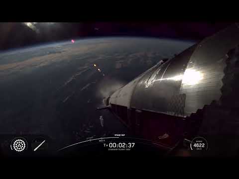 See the engine's throttling down cut off. >> Ship ignition stage separation. Use back burn startup.All right, successful hot staging maneuver. So, we've got 12 of the 13 engines lit back up on booster. So, it's doing its boost back.Real real excitingly though, we've got six out of six Raptors lit on ship there. So, it's now going to continue to make its ascent into outer. ...