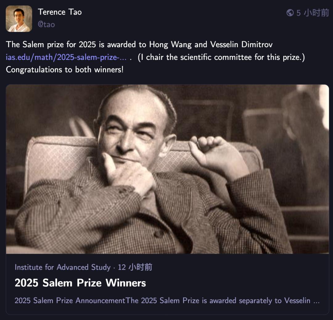 梦晨 鹭羽 发自 凹非寺 量子位 | 公众号 QbitAI 两项重量级数学大奖同天颁发,获奖者中都有 王虹 。 国际数学界的2025 塞勒姆奖 ,颁发给 王虹和Vesselin Dimitrov 。 塞勒姆奖被视为菲尔兹奖的风向标,据统计从1968年到2024年的56位塞勒姆奖获奖者中诞生了10位菲尔兹奖得主。例如陶哲轩在2000年获 得塞勒姆奖,2006年就获得了菲尔兹奖。 在获奖名单公布之后,陶哲轩也是第一时间发文恭喜。 另一边则是 世界华人数学家大会ICCM数学奖金奖 ,颁给王虹、邓煜、袁新意,三人都是北大数院校友。 世界华人数学家大会丘成桐发起,每三年举办一次,像菲尔兹奖一样限定45岁以下,也被称为"华人菲尔兹奖"。 从半路转专业到顶级数学机构终身教授 王虹的履历堪称学霸中的学霸。她原本在北大 地球与空间科学学院 就读,后来因为对数学的热爱转到了数学。 2011年从北大毕业后,她前往法国巴黎综合理工学院深造,又在巴黎第十一大学获得硕士学位。 2019年,她在MIT完成博士学位,导师是著名数学家Larry Guth。之后在普林斯顿高等研究院完成博士后研究,2021年加入加州大学洛杉矶 分校担任助理教授。 ...