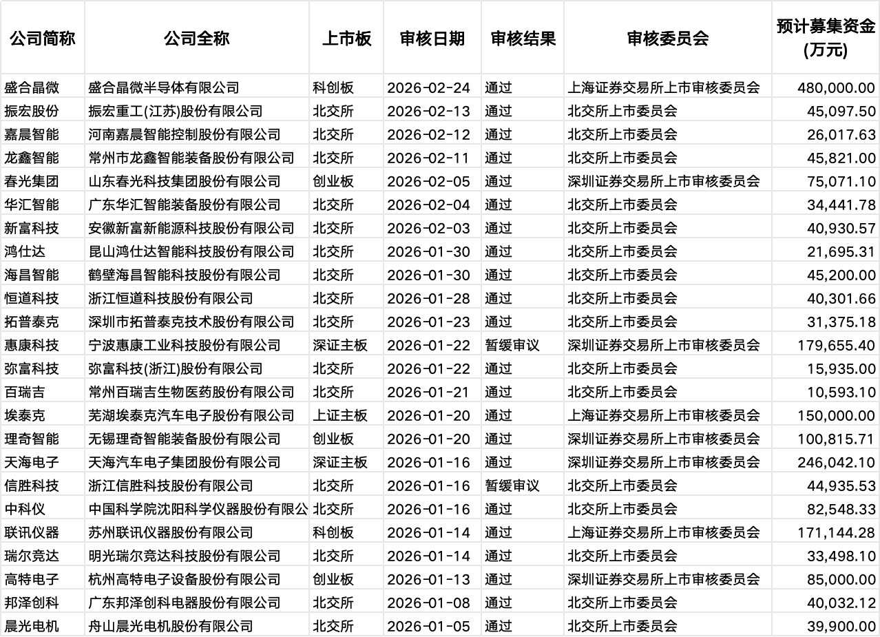 据上证所官网,2月24日,拟登陆科创板的盛合晶微半导体有限公司(下称"盛合晶微")过会,是马年首家A股IPO过会企业。与此同时,IPO审核继续推 进。根据安排,本周五(2月27日),北交所将召开上市委会议,上会企业为湖北龙辰科技股份有限公司。 从年内情况看,第一财经根据交易所数据统计,年初至今,三大交易所合计召开了30场上市委审议会议,包括北交所16场、上证所6场、深交所8场,共审议 首发企业24家,仅2家遭暂缓表决,其余全部过会,过会率超九成。 春节假期刚刚结束,农历马年的首家过会企业迅速出炉。 "目前来看,IPO审核有所提速,但考虑到季节因素,因为财报到期的关系,1月和2月通常是IPO过会家数比较多的月份。"有投行人士对记者表示。 业内预计,随着IPO在审企业数量持续减少,二级市场交易量维持高位,一、二级市场实现动态平衡之后,IPO市场将进一步回暖。 年内IPO过会率超九成 最新过会的盛合晶微,其IPO申请于去年10月底获受理,保荐券商为中金公司。此后,该公司完成两轮审核问询,IPO排队时间不到四个月,于2月24日过 会。 资料显示,盛合晶微属于半导体封测行业企业,主营业务收入由中段硅片加工、晶圆级封装、 ...