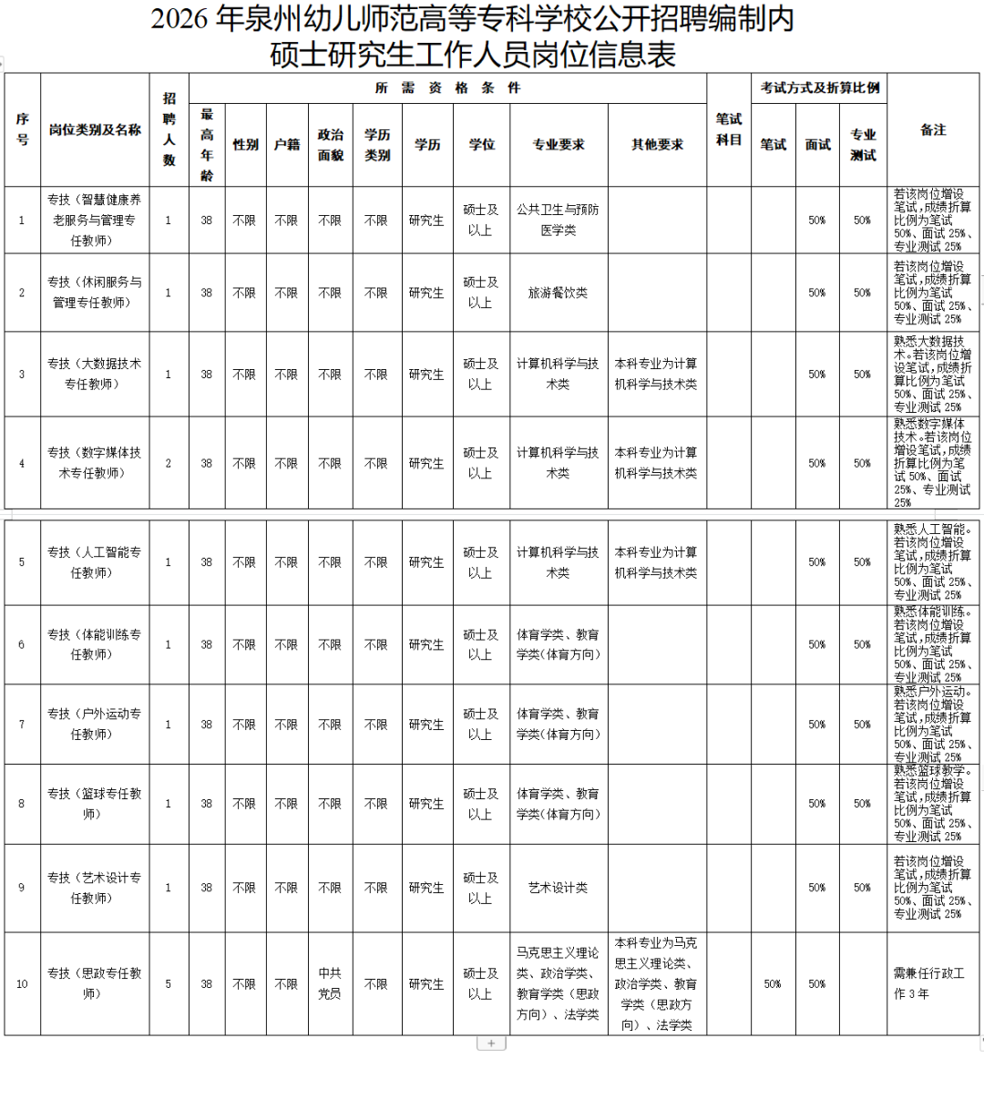 编制内硕士研究生15名 一起来看 转自:泉州发布 近日 泉州幼儿师范高等专科学校 公开招聘 泉州幼儿师范高等专科学校公开招聘编制内硕士研究生15名 报名时间 2026年1月10日8:30至2026年1月16日17:30 报名方式 报名采取网上报名的方式进行。符合条件的报考者请于报名截止日期前登录福建就业网首页"事业单位公开招聘"模块,按系统要求进行网上报名。 招聘岗位 | | | 招 | 版 | | | | 所 | ਜ਼ਿੰ | 资 格 条 件 | | | | 考试方式及折算比例 | | | | --- | --- | --- | --- | --- | --- | --- | --- | --- | --- | --- | --- | --- | --- | --- | --- | | નિ | 岗位类别及名称 | 聘 | | | | | 学历 | | | | | 撃試 | | | 备注 | | 号 | | 人 | 高 स्ट | 性别 | 户籍 | 政治 面貌 | 类别 | 学历 | 学位 | 专业要求 | 其他要求 | 科目 | 望试 面试 | 专业 测试 | | | | | 数 | | | | | | ...