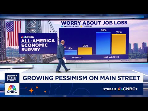 Growing pessimism from Americans on the jobs and inflation front according to CNBC's latest All-America economic survey. Let's get over to Steve Leman. He's got some of the key takeaways for us.Steve, >> thanks Dave. Yeah, the public's concern with losing their job grew in the latest allameric survey along with ongoing worries about inflation and wages not keeping up. Take a look.28% or 20 sorry, 26% of the public is worried about losing their job. Uh, and that's up from the average of the last several time ...