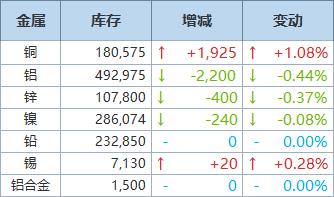 》查看更多金属库存信息 | 金屋 | 库存 | 増減 | 变动 | | --- | --- | --- | --- | | 国 | 159,400 ↑ +3,100 ↑ | | +1.98% | | 铝 | 507,175 ↑ +24,175 ↑ | | +5.01% | | # | 111,850 J | -450 1 | -0.40% | | 臭 | 284,664 | -72 1 | -0.03% | | 铝 | 222,650 J | -2,925 J | -1.30% | | 锡 | 7,210 1 | +250 ↑ | +3.59% | | 铝合金 | 1,500 | 0 - | 0.00% | | LME库存 | | --- | | 金屋 | 阵存 | 注册仓单 | 变动 | 注销仓单 变动 | 注销品比 | 日出 | | --- | --- | --- | --- | --- | --- | --- | | 테크 | 159,400 | 112,575 | 11 +3.76% | 46,825 -2.04% | 29.38% | 30.58% | | 铝 | 507,175 | | 478,3 ...