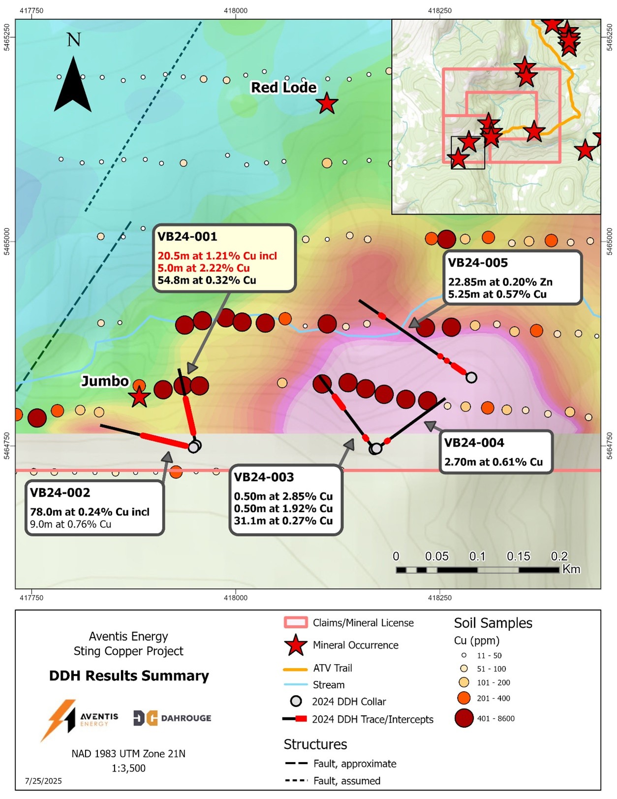 Core Insights - Aventis Energy has contracted Dahrouge Geological Consulting to prepare a Technical Report for the Sting Copper Project, which is a significant step in the company's growth strategy [2][4]. Company Overview - Aventis Energy Inc. is focused on mineral exploration, particularly in battery, base, and precious metals, and is advancing projects in stable jurisdictions, including the Sting Copper Project [11]. Project Details - The Sting Copper Project is located in western Newfoundland, Canada, covering approximately 3,700 hectares [13]. - The project has shown promising drilling results, including 54.8 meters at 0.32% Cu from drill hole VB24-001 and high-grade intervals with samples ranging from 0.96% to 5.43% Cu [13]. Technical Report Purpose - The Technical Report aims to provide a comprehensive update on the Sting Project, compiling historical data and recent drilling results to guide future exploration and drilling programs [4][9]. Historical Data - Historical channel samples from the Jumbo Lode within the Sting Copper Project have shown high copper grades, with assays of 14.3% Cu over 3.1 meters and 9.0% Cu over 9.14 meters [5][9]. - Previous estimates indicated high-grade ore within Jumbo at 14.7% Cu and 14,714 tons, with disseminated ore at 6.0% Cu and approximately 26,956 tons [5]. Expertise of Consulting Firm - Dahrouge Geological Consulting has a long-standing history in mineral project development, recognized for its expertise in exploring critical elements since 1971 [3].